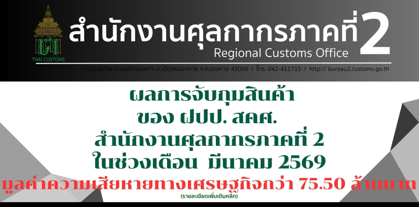 วันที่ 5 เมษายน 2569 กรมศุลกากร โดยสำนักงานศุลกากรภาคที่ 2 ร่วมกับหน่วยสืบสวนปราบปรามประจำพื้นที่ภาคตะวันออกเฉียงเหนือ ฝปป.2 สปป.1 กสป. ร่วมกันตรวจค้นรถบรรทุก (10 ล้อ) บริเวณถนนในพื้นที่อ.ยางตลาด...